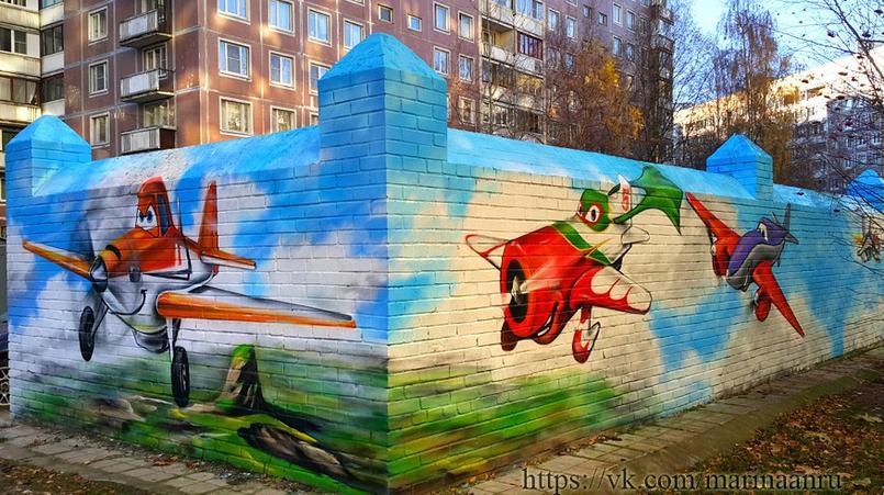 В одном из кварталов Приморского района Петербурга неизвестные артисты разрисовали ограждения площадок для мусора, сообщили очевидцы в «ВКонтакте». В разных дворах — разные рисунки. Так, художники изобразили на стенках самолеты, тропический лес, летнюю поляну и героев сказок.