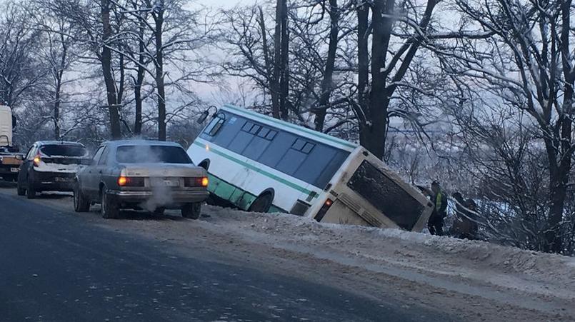 На Московском шоссе водитель автобуса решил обогнать пробку и оказался в кювете