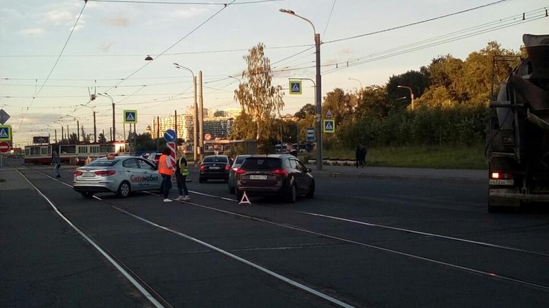 Прямо на путях на перекрёстке Товарищеского проспекта и улицы Дыбенко столкнулись два автомобиля Kia. Авария, по словам очевидцев, несерьёзная, однако трамваи в обе стороны встали.