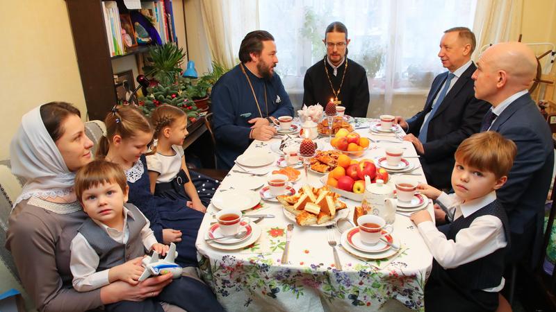 Беглов поздравил многодетную семью Куйбышевых с Новым годом и Рождеством, а также вручил подарки от города: стиральную машину и развивающие книги. Главой семейства является священник, мать работает врачом-кардиологом. В семье воспитывается четверо детей от 2 до 10 лет.