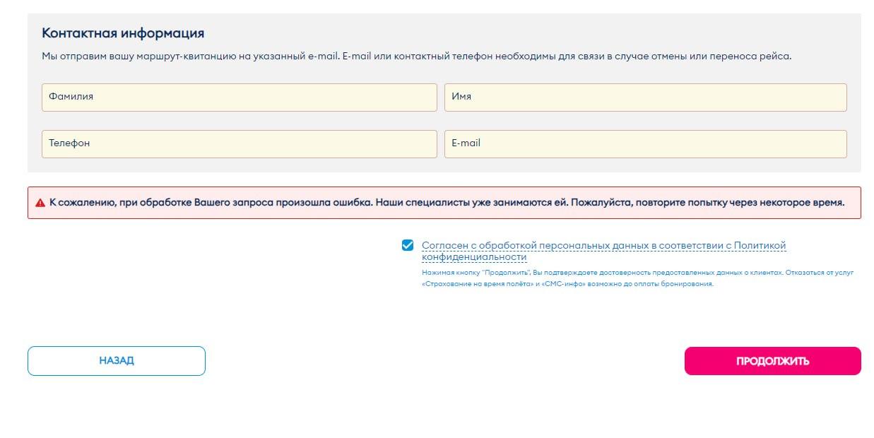 В итоге билет с горем пополам был куплен, но на этом испытания не закончились. При попытке приобрести обратный билет сайт «Победы» окончательно сломался, а кнопка оплаты просто исчезла.