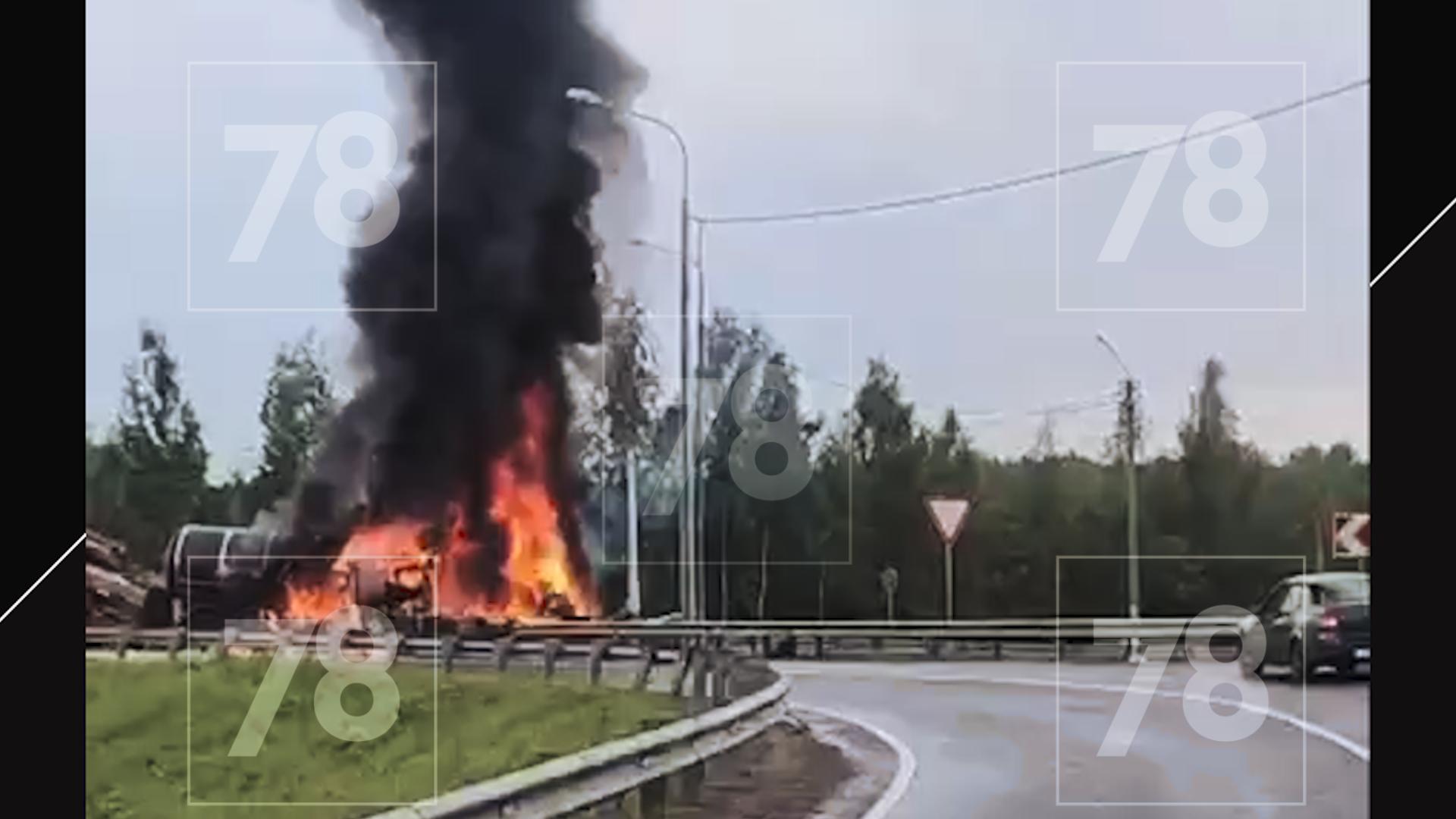 На развязке трассы А-120 и Московского шоссе в Тосненском районе горит фура с битумом. Возгорание произошло после столкновения большегруза с лесовозом.