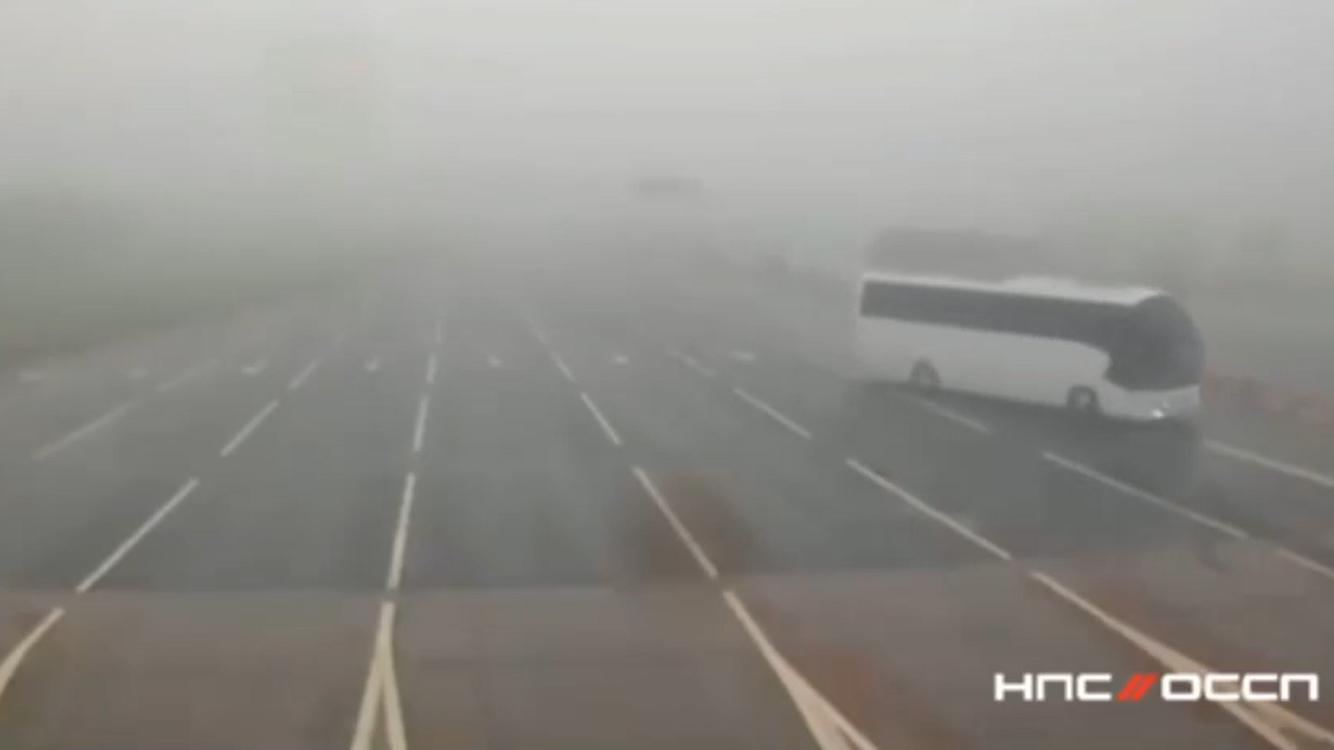 Из-за сильного тумана водитель поздно заметил, что приближается к пункту взимания платы. Он начал тормозить, но на скользкой после дождя дороге автобус занесло и развернуло, после чего он врезался в пункт взимания платы и опрокинулся.