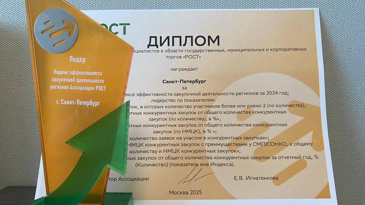 Петербург награждён знаком отличия «Лидер индекса эффективности закупочной деятельности» Ассоциации «РОСТ».