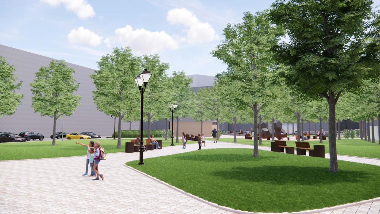 В плане указано, что в сквере будут установлены скамейки, построен детский скалодром и выполнено мощение плиткой. Также на территории создадут декоративное покрытие из коры и планируется дополнительное озеленение территории.