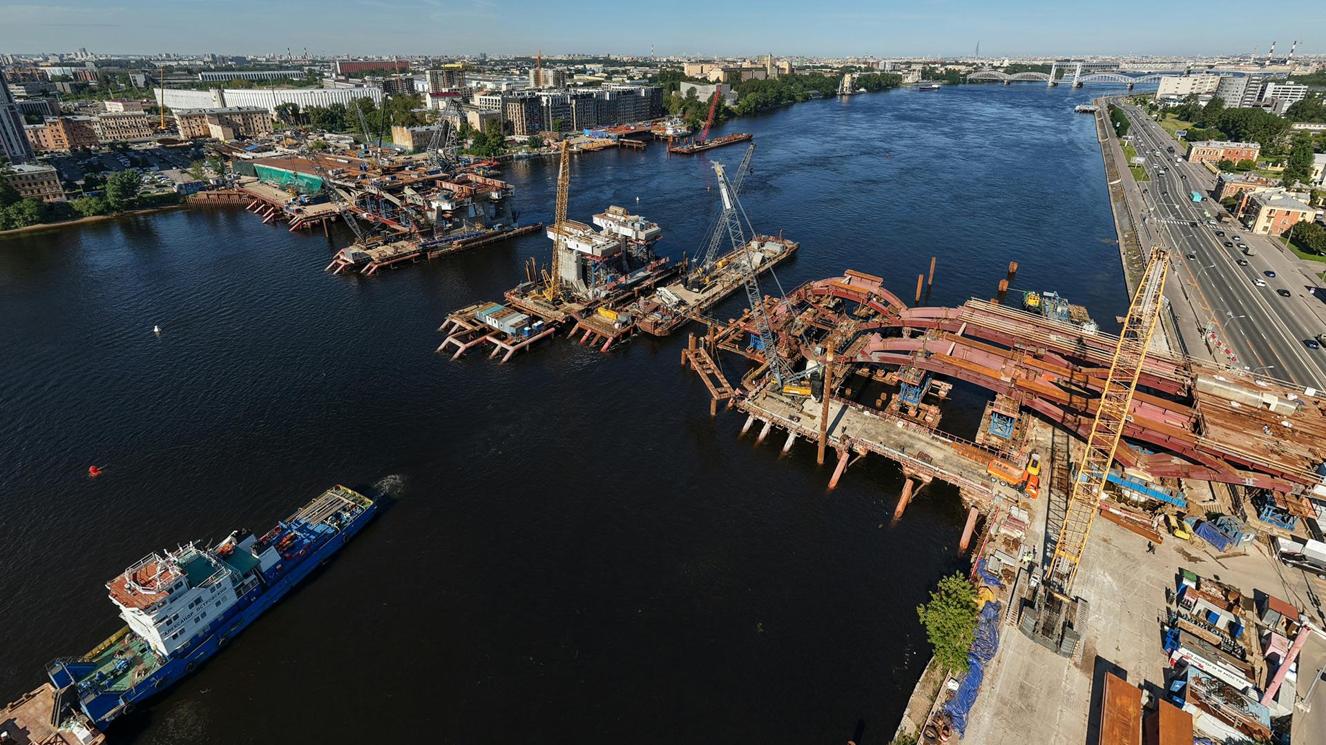 На строительстве первой за почти 43 года разводной переправы через главную водную магистраль города задействовано более 500 специалистов и 87 единиц строительной техники.