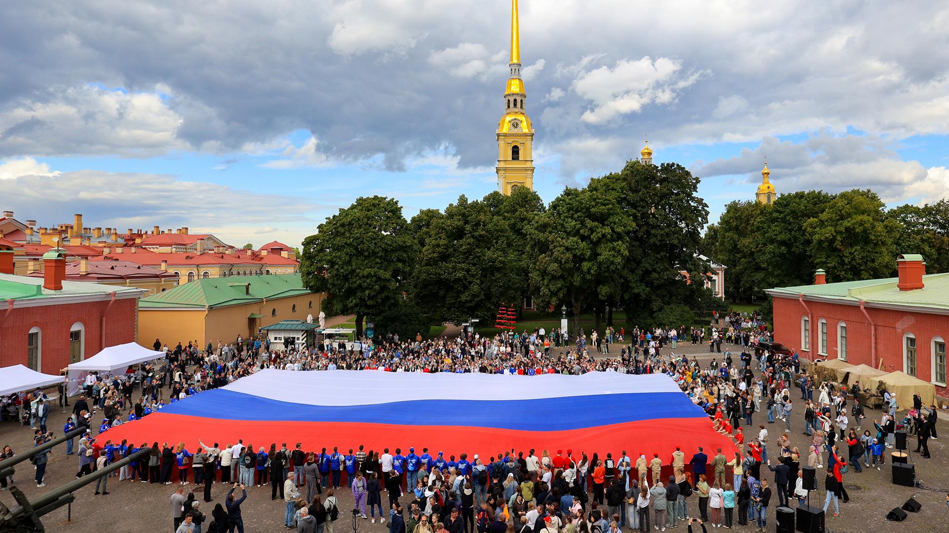 На территории Петропавловской крепости развернули огромный триколор размером 30х50 метров.