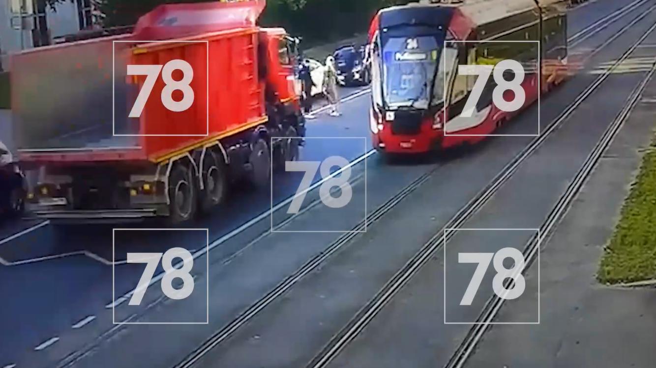 Около 16:00 в четверг, 2 октября, в Невском районе Петербурга произошла авария. На проспекте Обуховской Обороны грузовик снёс идущего к трамваю человека. В распоряжении 78.ru оказалась запись с камер видеонаблюдения.