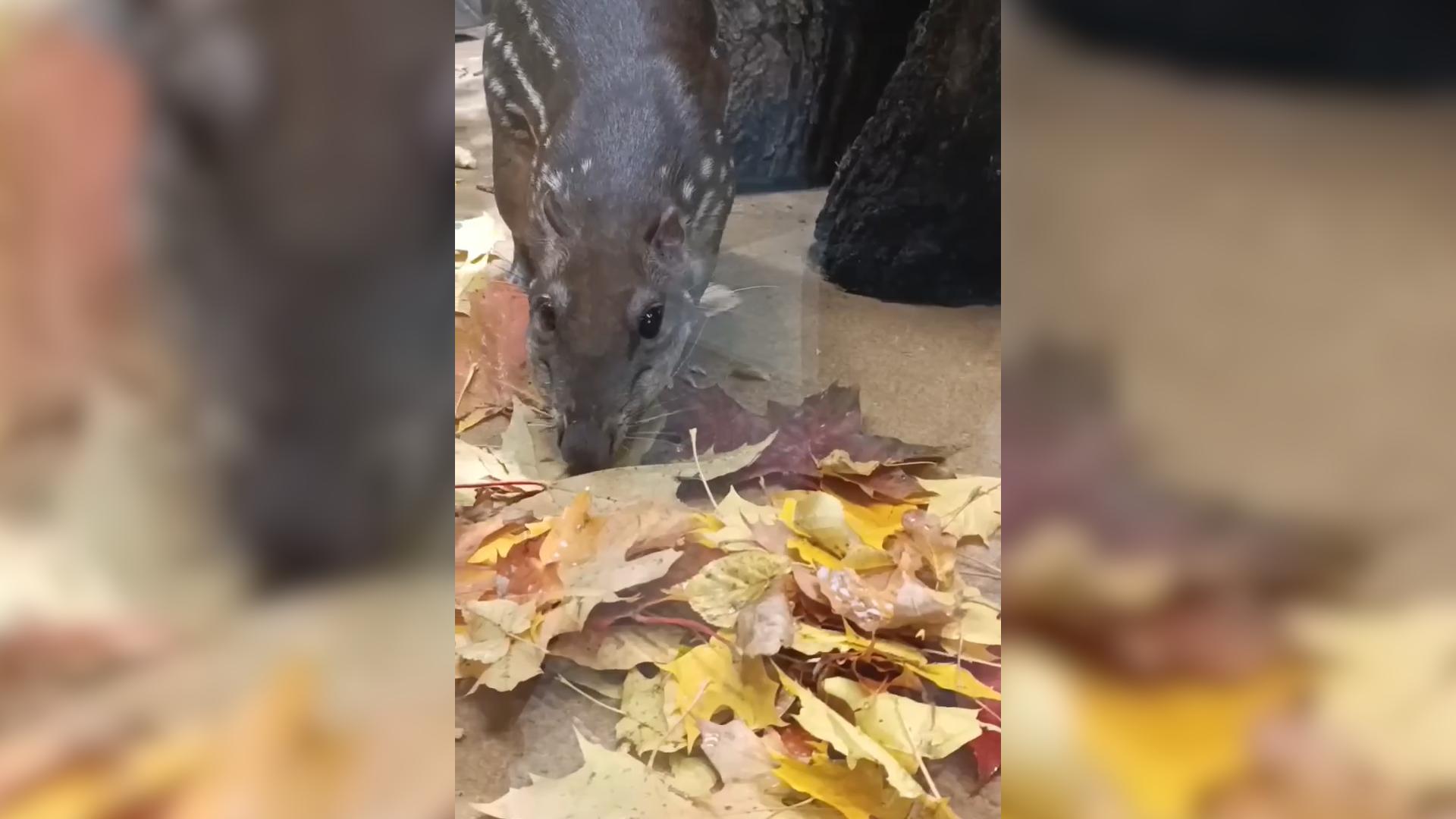 Пака Гринхарт начал обновлять свой домик осенней листвой в Ленинградском зоопарке