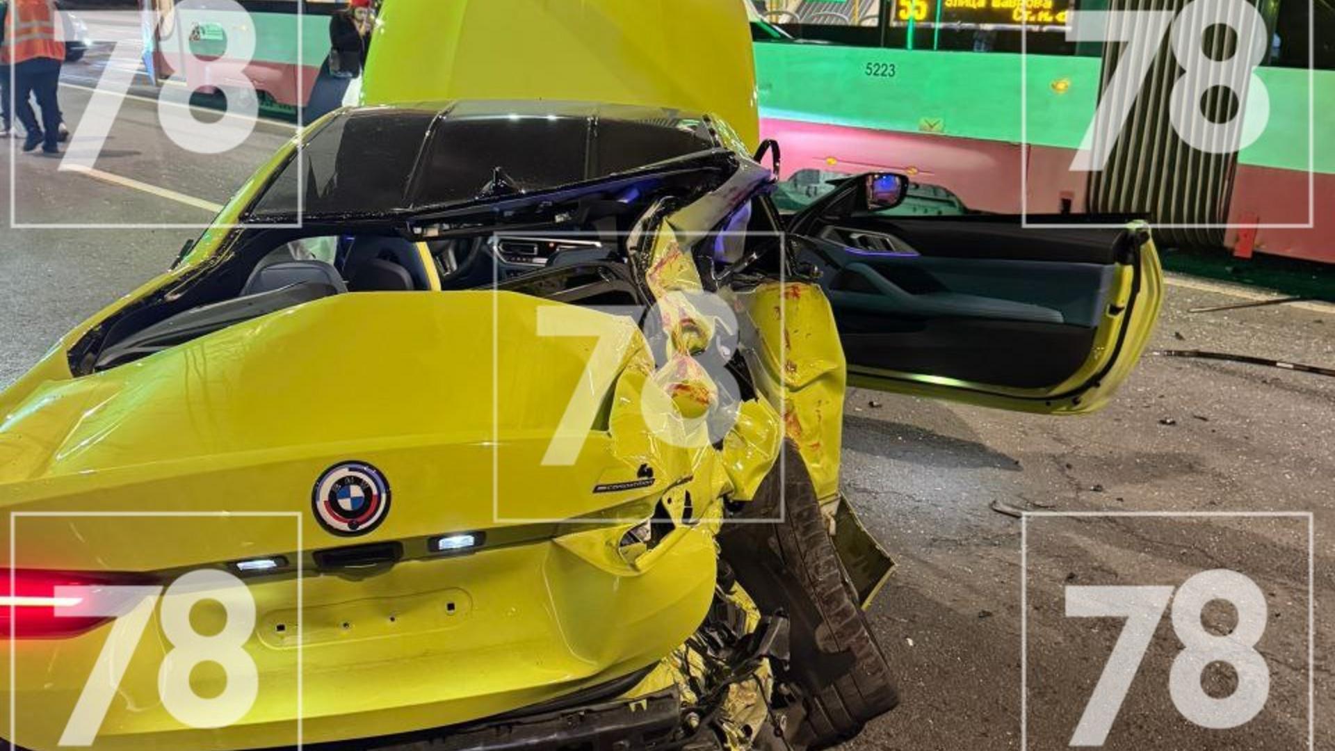 Сегодня вечером на Политехнической улице в Калининском районе Петербурга жёлтый спорткар пытался на высокой скорости обогнать лазурный автобус, когда тот перестраивался на крайнюю полосу. В результате водитель BMW потерял управление, пересёк трамвайные рельсы и вылетел на встречную полосу, где врезался в полицейскую машину. От удара жёлтый спорткар отлетел к идущему по рельсам трамваю.