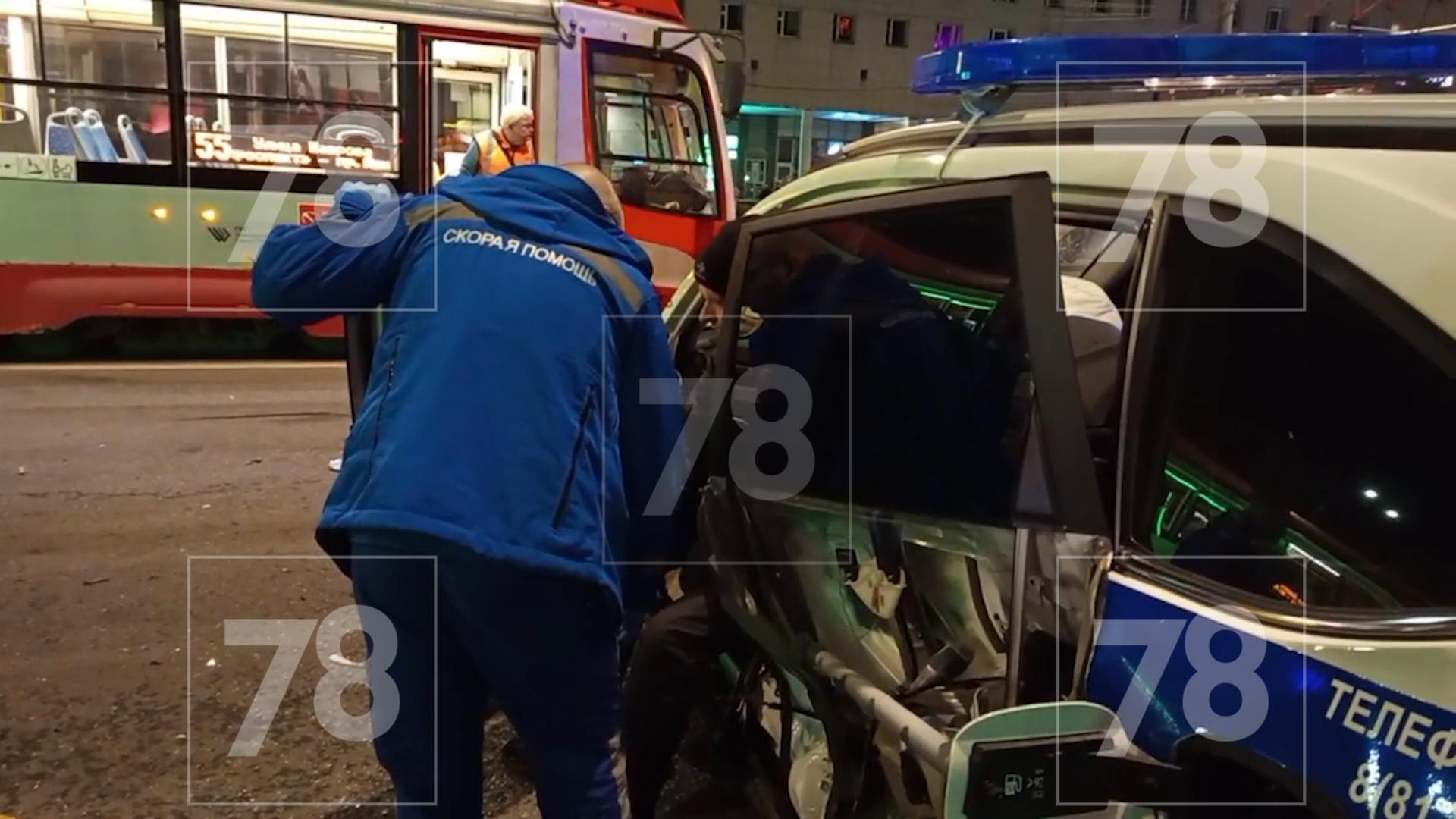 На место аварии прибыли экстренные службы. Пострадавшего полицейского деблокировали спасатели, его погрузили на носилки. Со вторым участником ДТП — молодым и кучерявым водителем спорткара — всё в порядке. По улице парализовано движение трамваев.