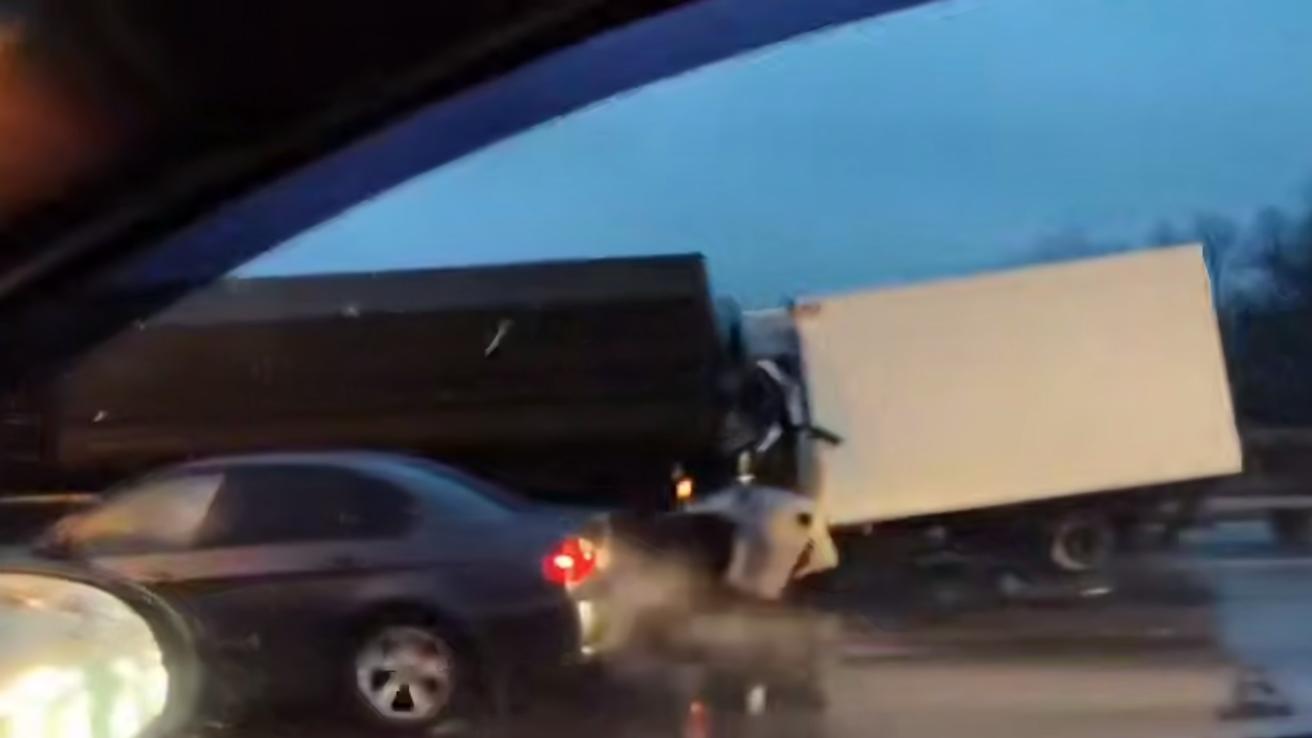 Один человек пострадал в результате столкновения легковушки и двух грузовиков на КАД