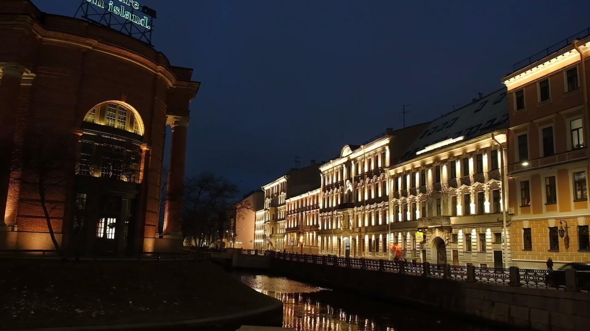 На набережной Адмиралтейского канала завершены работы по архитектурно-художественному световому оформлению фасадов пяти зданий, расположенных неподалёку от площади Труда.