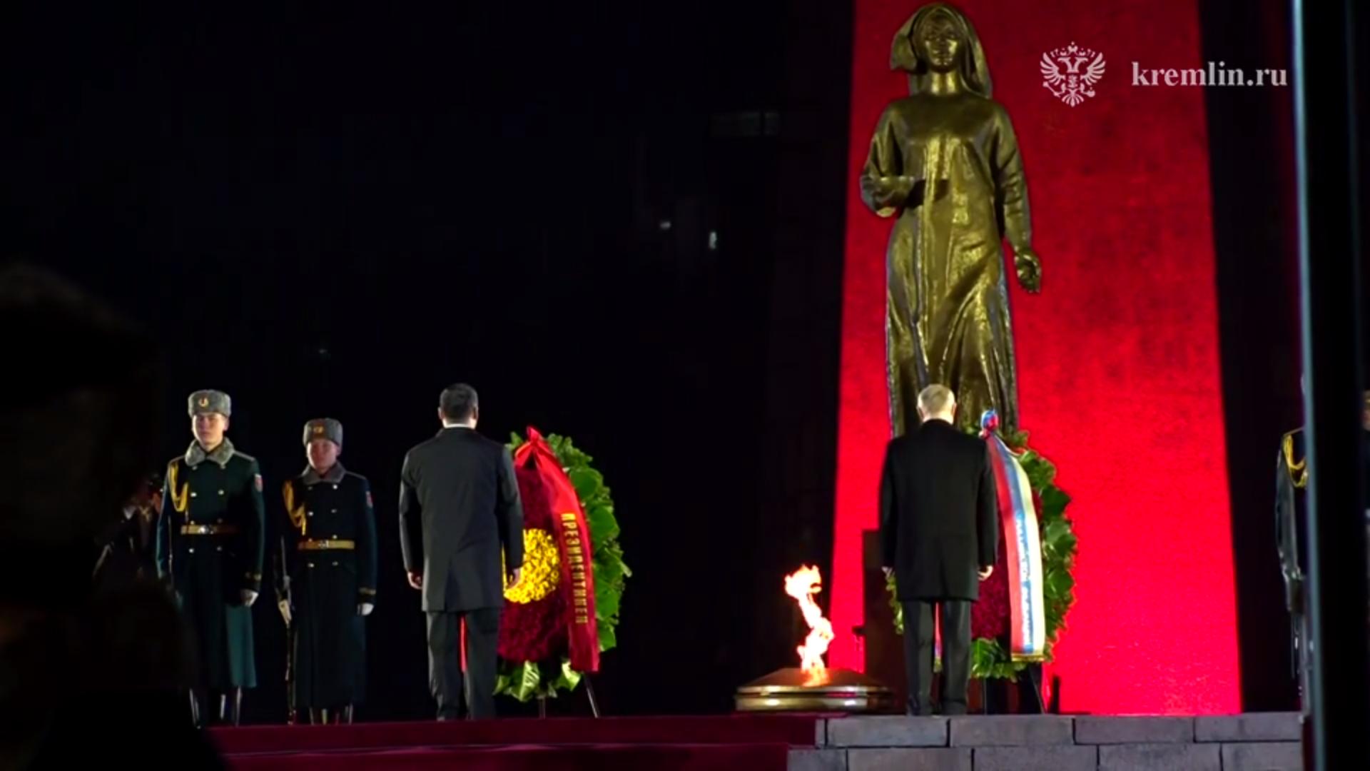 После приветственной церемонии Владимир Путин и Садыр Жапаров отправились к мемориальному комплексу «Вечный огонь» на площади Победы в киргизской столице. Этот комплекс был построен в честь 40-летия Победы в Великой Отечественной войне, и его центральный памятник, состоящий из трёх полудуг, символизирует юрту. Под ними располагается скульптура женщины-матери, ждущей возвращения своих родных с войны. Оба лидера возложили венки к мемориалу, отдавая дань памяти павшим воинам.