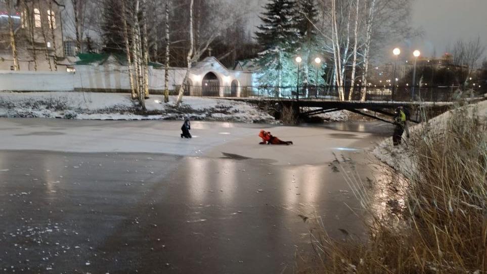 При эвакуации лёд под девушкой треснул и она частично оказалась в воде.