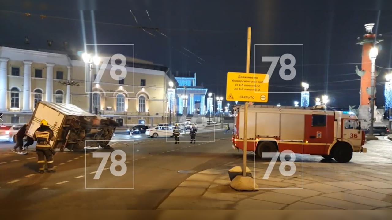 Грузовик перевернулся во время ДТП у Дворцового моста