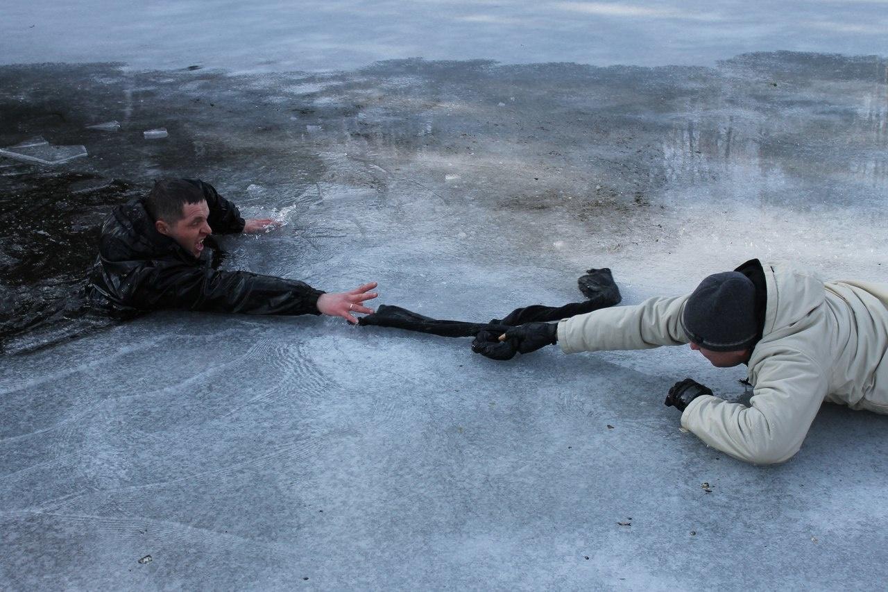 - Осторожно ложитесь на край льда и поочерёдно вытаскивайте ноги на поверхность;