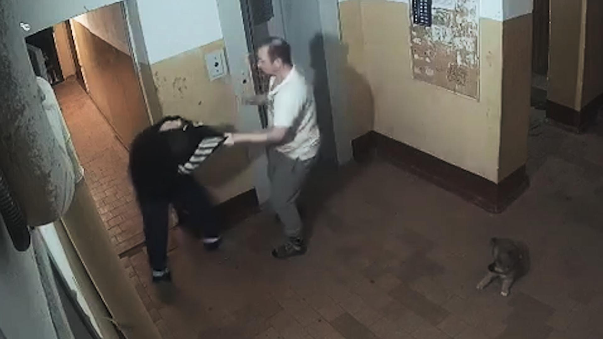 Сначала мужчина в чёрном худи пытался побить песика, но его остановил сосед, который несколько раз ударил обидчика.