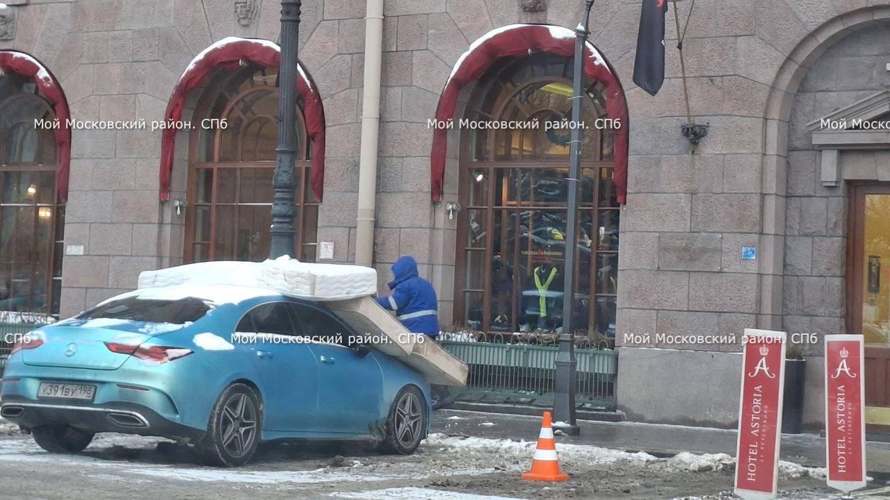 Ранее 78.ru писал, что коммунальщики в Адмиралтейском районе во время уборки крыш возле гостиницы «Астория» прикрывали автомобили. Они использовали три матраса, чтобы защитить Mercedes от падающих снежных куч и сосулек.