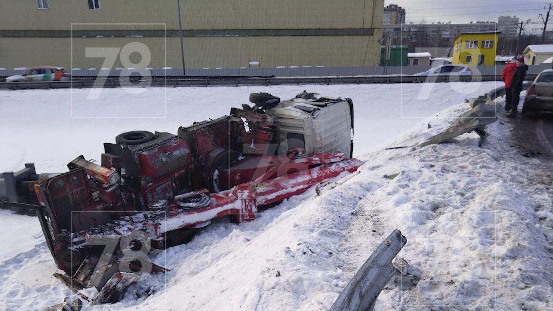 Водитель автовышки врезался в ограждение и улетел в кювет на 32 километре КАД. Об этом стало известно 78.ru.