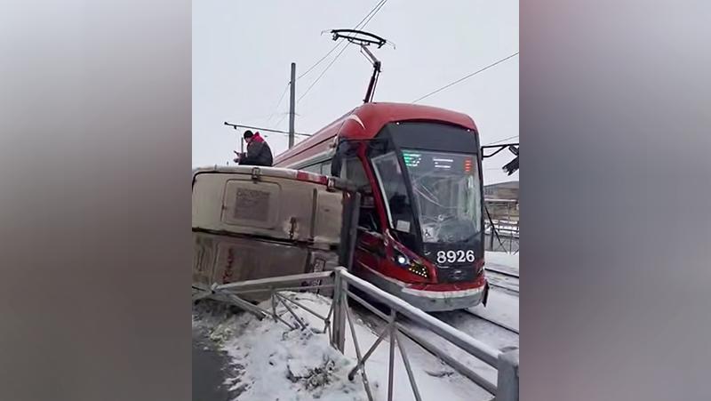 В Петербурге на улице Корабельной столкнулись трамвай и микроавтобус Mercedes.