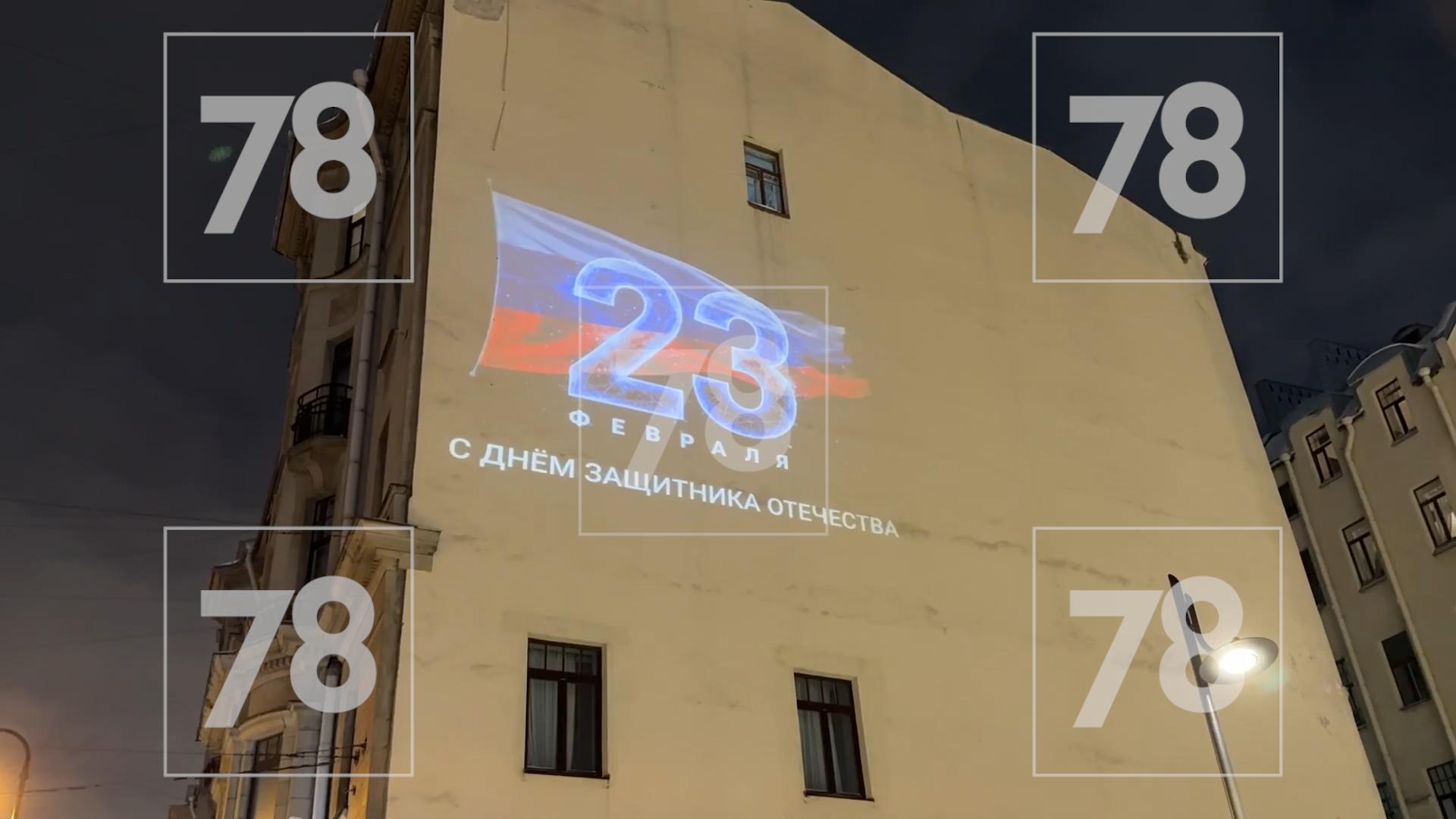 В Петербурге фасады домов сразу на нескольких адресах украсили световыми проекциями в честь Дня защитника Отечества.