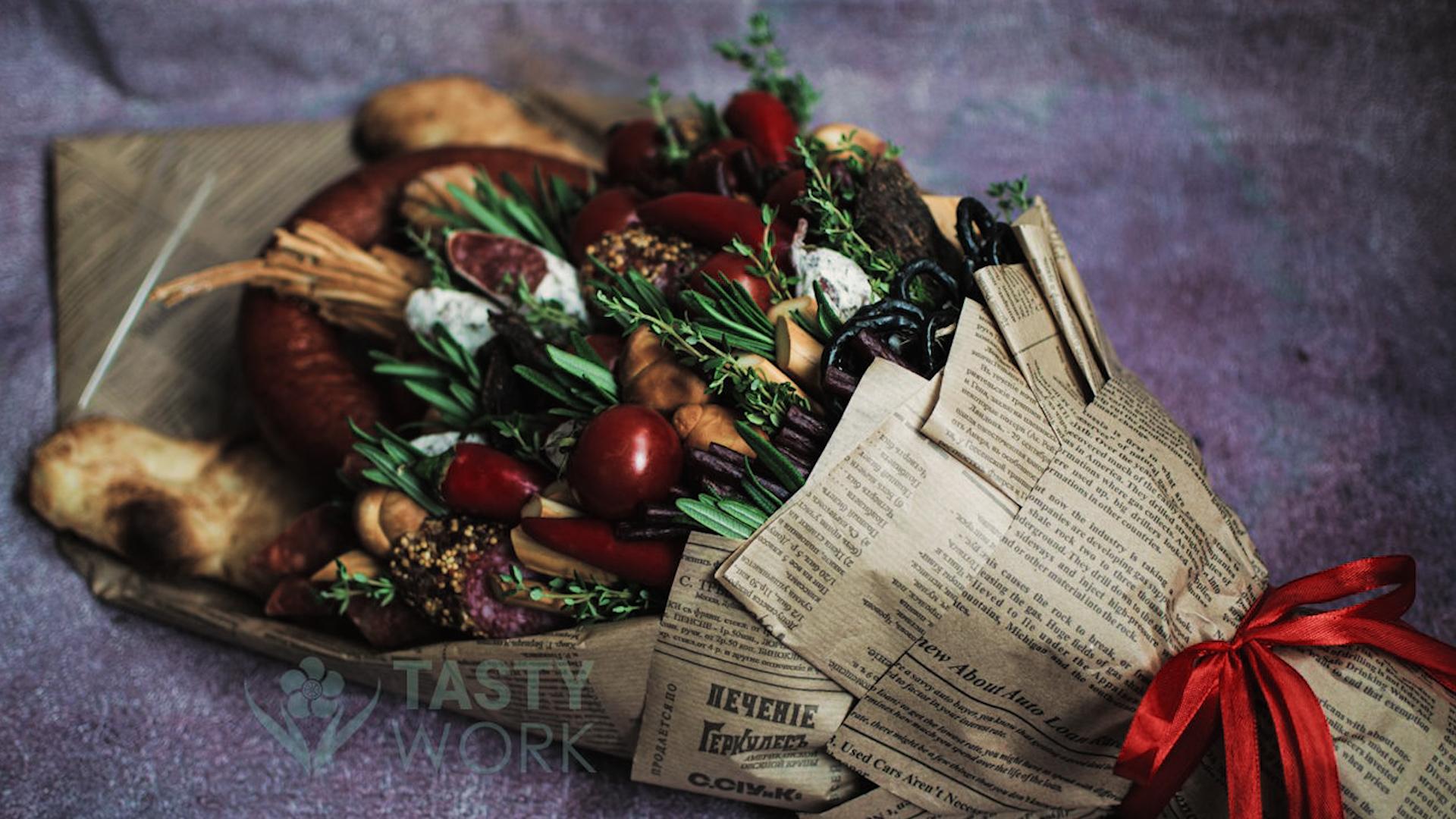 Альтернативой такому подарку могут служить полезные композиции и букеты: фруктовые, ореховые или овощные.
