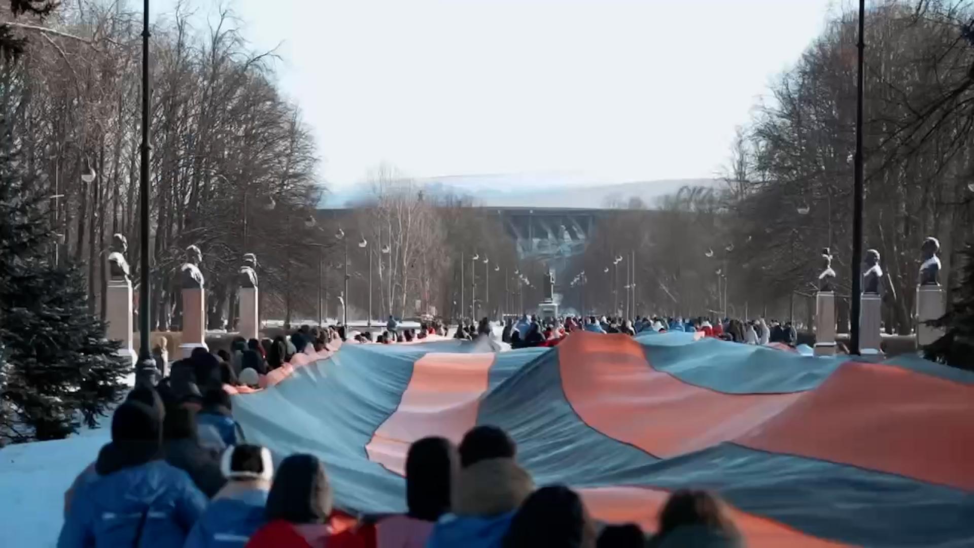 В Петербурге в честь Дня защитника Отечества на Аллее Героев растянули 300-метровую Георгиевскую ленту.