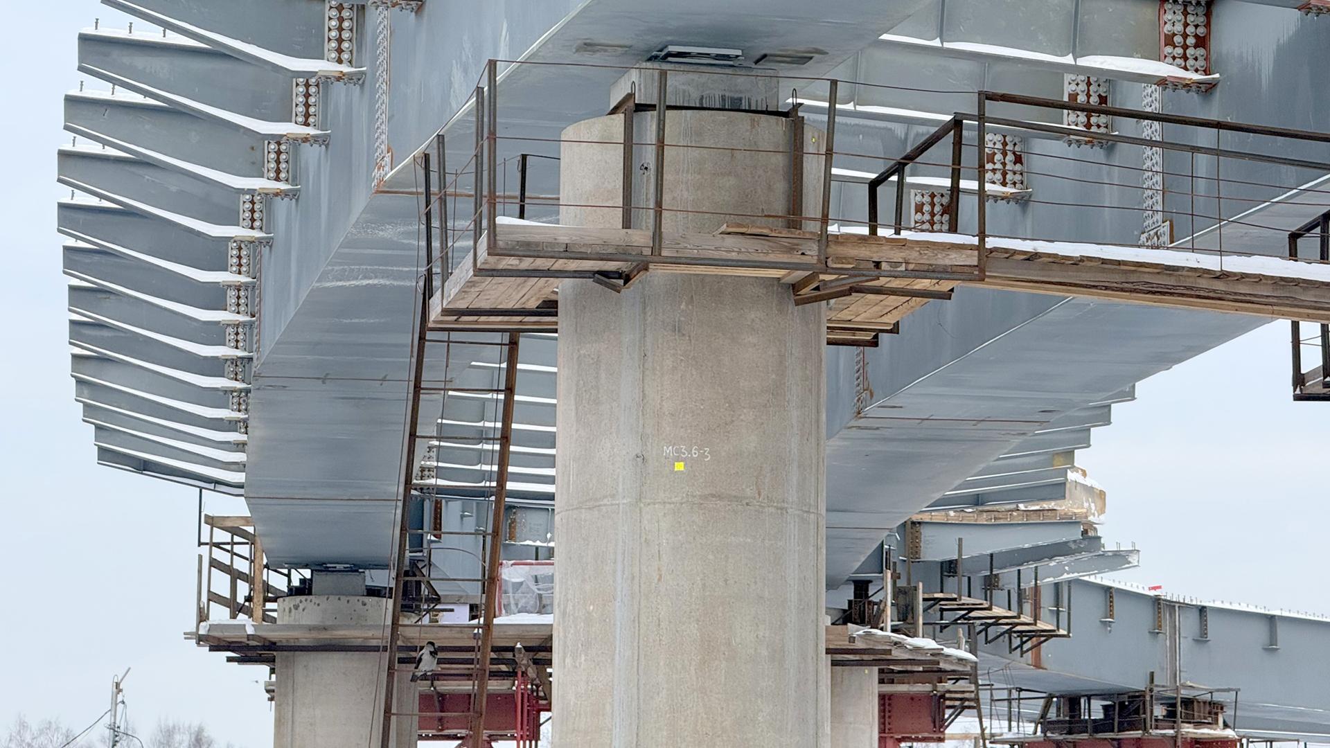 На развязке уже строят первые съезды. Специалисты завершают монтаж металлических конструкций пролётных строений. Формирование профиля будущего сооружения идёт полным ходом: балки установлены на всех доступных опорах.