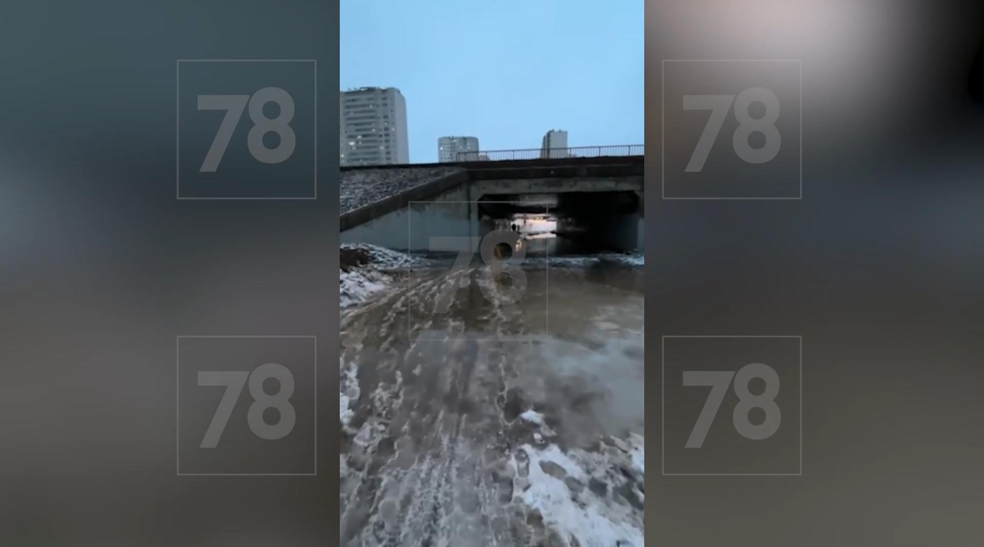 В ЖК «Цветной город» жители столкнулись с неприятным инцидентом. Они не могут пройти по пешеходному переходу, так как он затоплен и сильно обледенел. Об этом 78.ru сообщил местный житель Давыд.