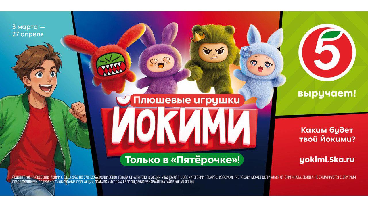 С 3 марта по 27 апреля торговая сеть «Пятёрочка» запускает масштабную акцию Йокими — коллекционными плюшевыми героями, которых объединяют добрые дела! 16 уникальных персонажей, каждый — со своим настроением и характером.