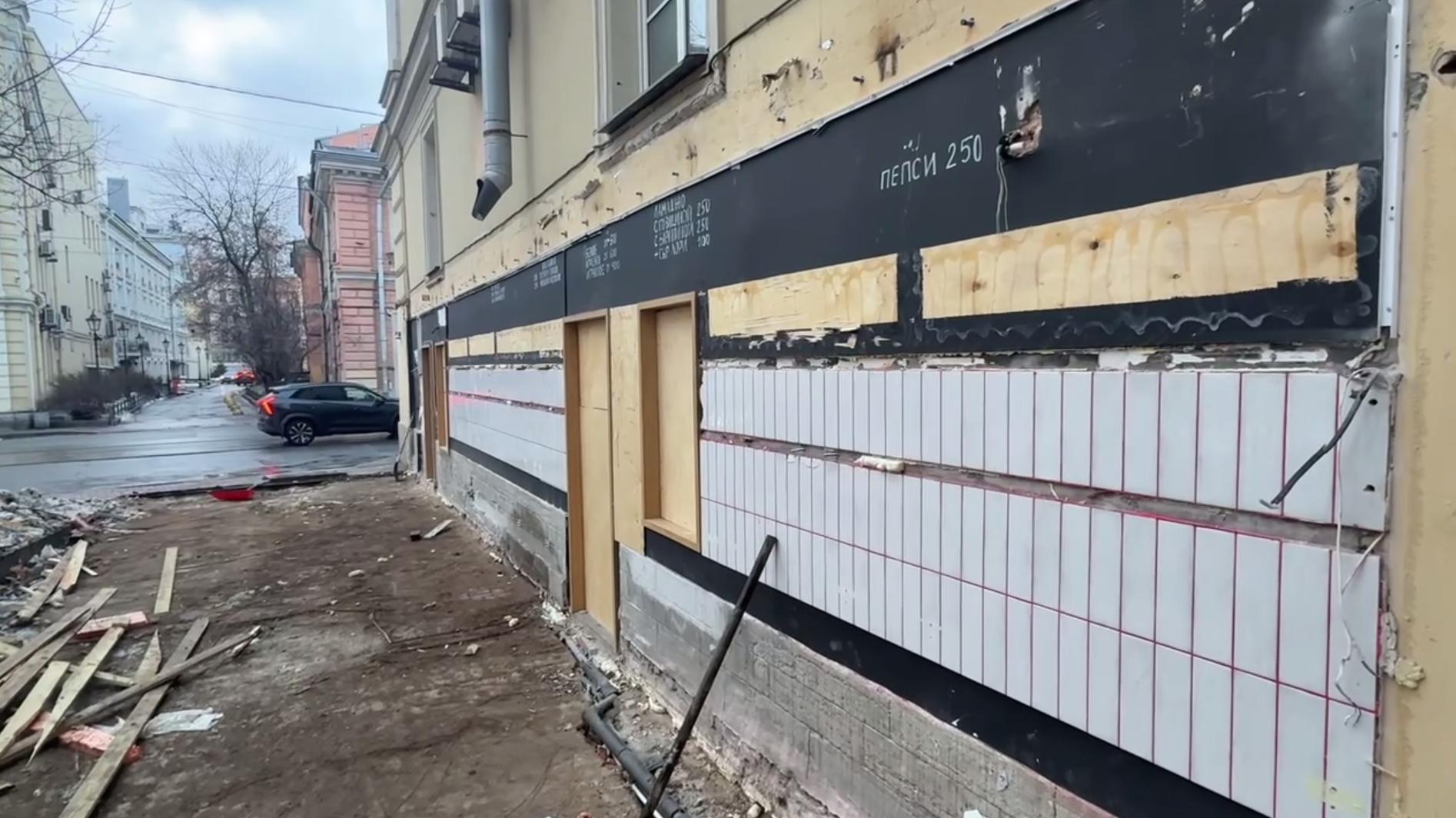 Бывший арендатор не только не уничтожил пристройку самостоятельно, но и зачем-то изуродовал фасад здания плиткой и трубами, не потрудившись получить на это согласования.