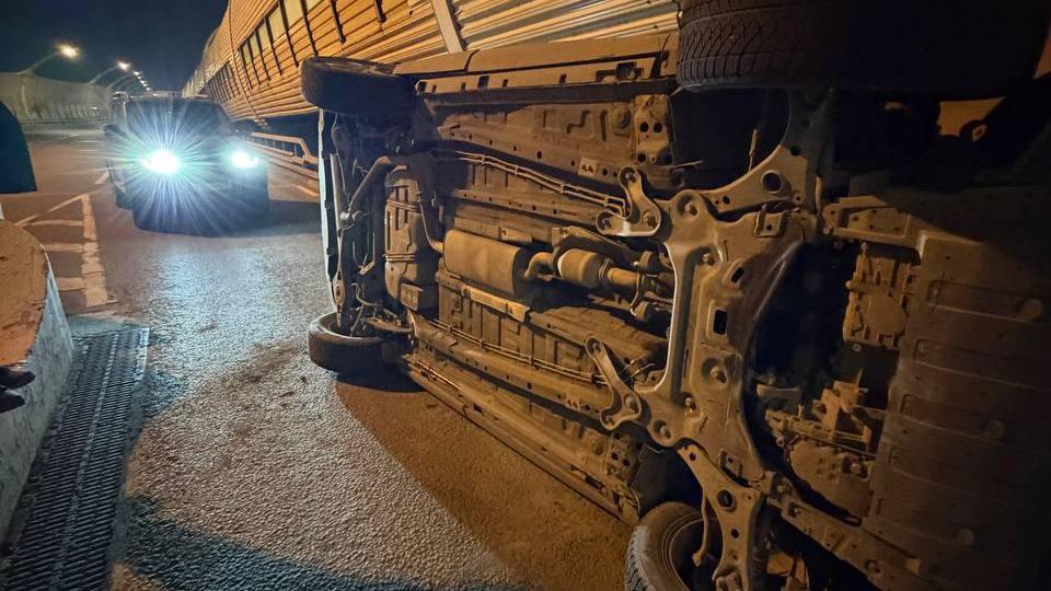 Минувшей ночью на Западном скоростном диаметре (ЗСД) Петербурга у пункта оплаты на Богатырском проспекте произошла авария. Автомобиль сдал назад, наехал на бордюр, а затем перевернулся на бок. К счастью, никто не пострадал.