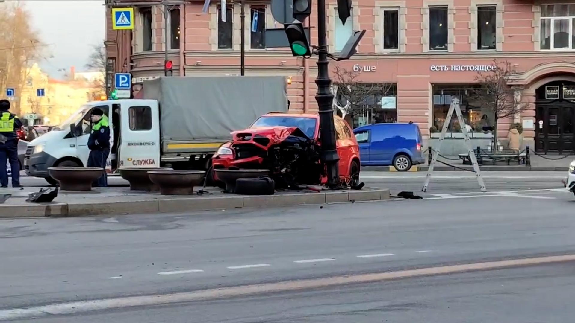 Кроссовер BMW влетел в столб около метро «Петроградская» в Петербурге