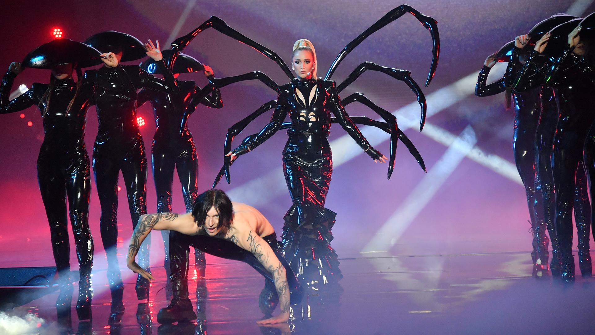 Едва начавшись, шоу взорвалось: певица мгновенно сбросила свои длинные одеяния, явив публике ту самую «Бузову» — в дерзком белом мини с бахромой, колготках в сетку и золотых ремешках. Сразу же начались зажигательные танцы с командой. Затем последовала смена образа на красное сияющее платье и высокие кожаные сапоги, а кульминацией стал поразительный наряд паучихи с облегающим чёрным латексным боди.