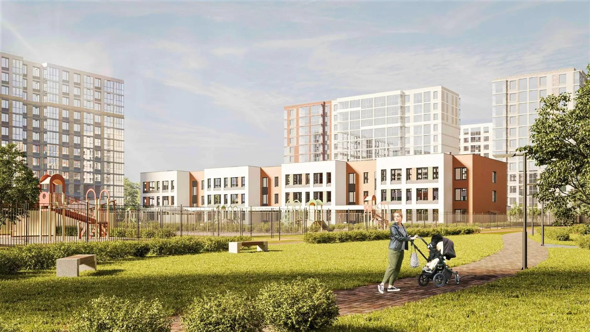 Сейчас в этом же квартале застройщик продолжает возводить большую школу на 1850 мест и ещё один детский сад для 100 малышей.